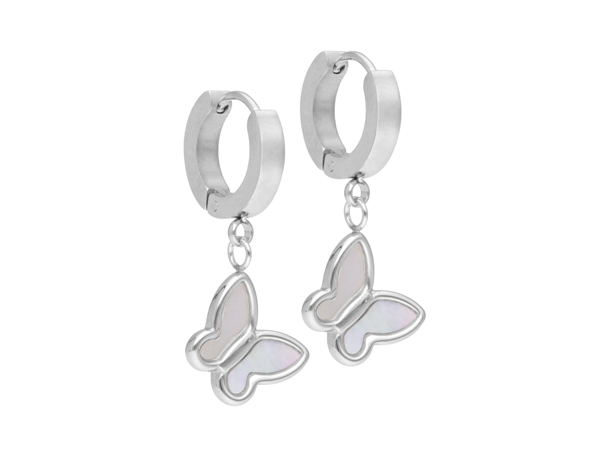 Caravanas tipo aro de acero con dije colgante diseño de mariposa.