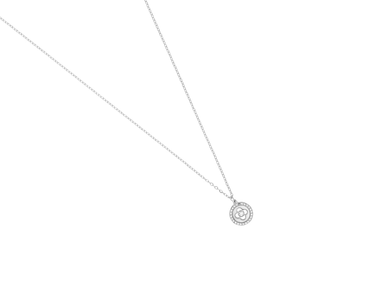 Collar de Acero y dije diseño redondo en nácar y circonias.