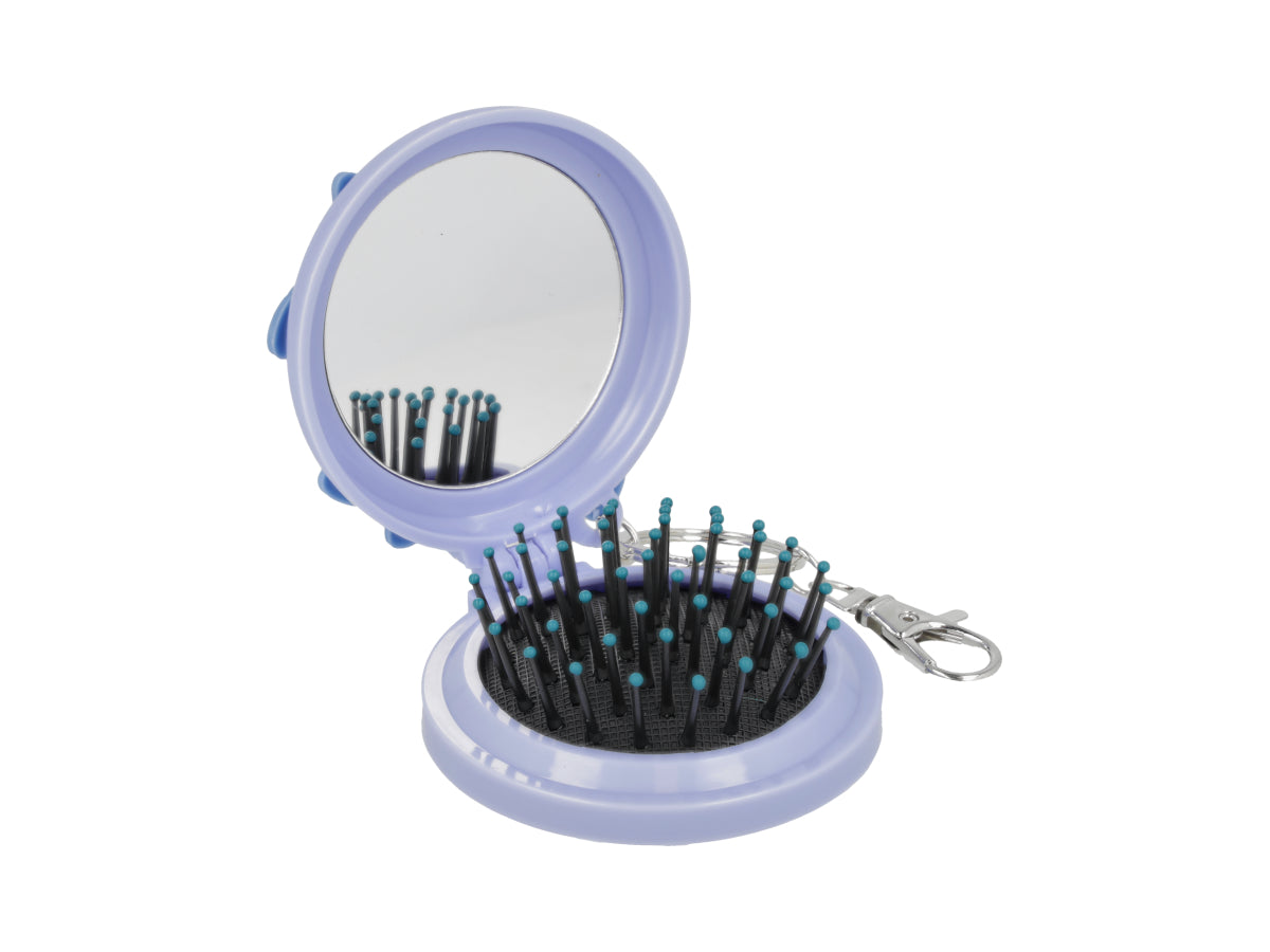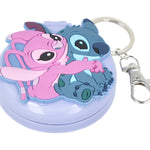 Cuenta con un espejo redondo compacto con un diseño de Ángel y Stitch 3D que también se pliega como cepillo y viene con un llavero perfecto para sujetar las llaves.