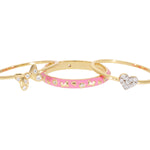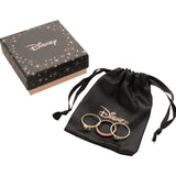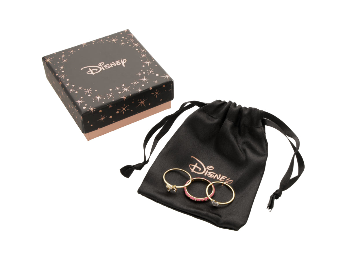 Disney el trio de anillos incluye un anillo con un corazón con circonias,un anillo en esmalte rosa con corazones dorados,lazos de Minnie Mouse y circonias.