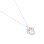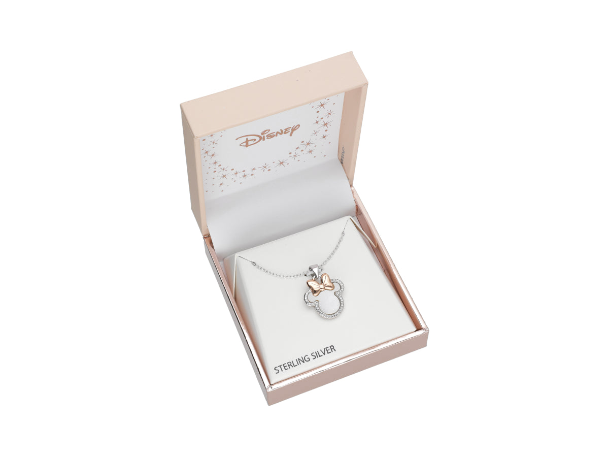 Collar en Plata 925 diseño de Minnie Mouse en nácar con circonias y lazo enchapado en oro.