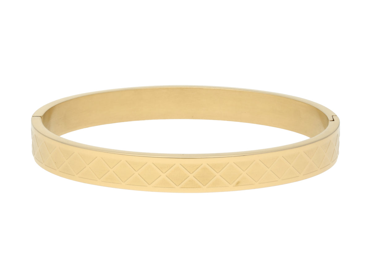 Esclava de acero con baño de oro y diseño.