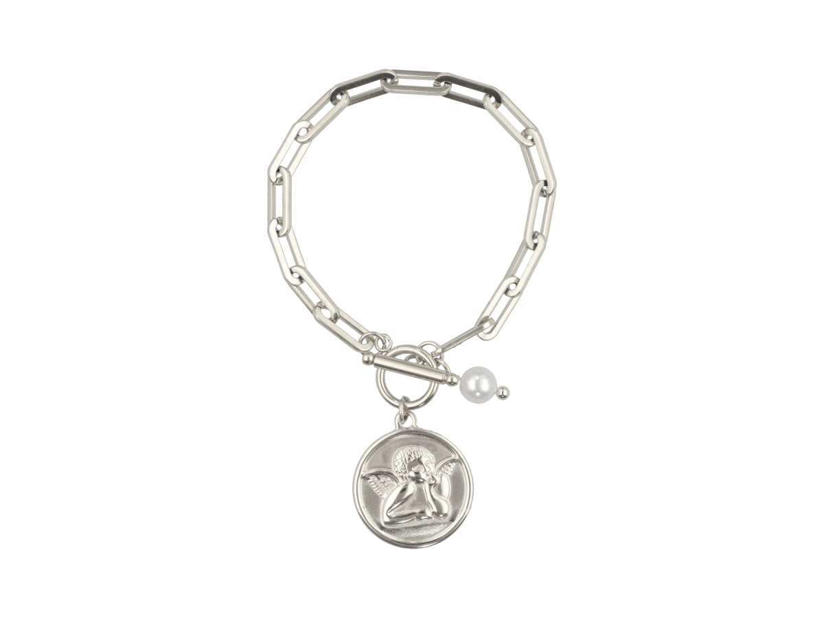 Pulsera de Acero con cierre traba con perla y medalla de Ángel de la Guarda.