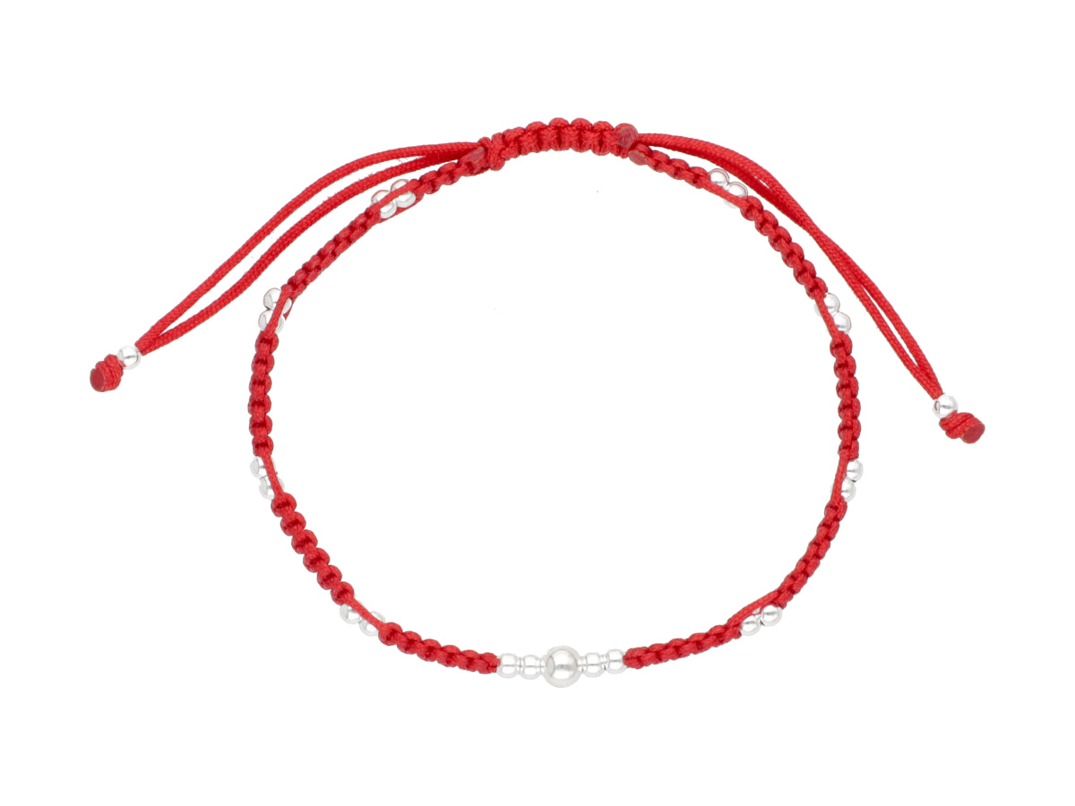 Pulsera hilo rojo en macramé con diseño de bolitas en plata 925 y terminación en puntas con dos esferas en plata.