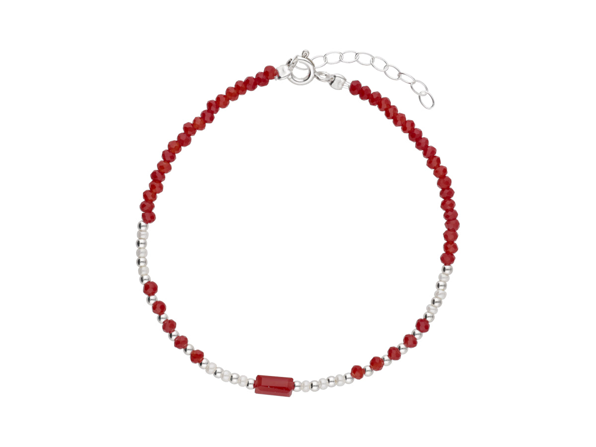 Pulsera de cristal en color rojo plata 925 con diseño de cristal central y perlas.