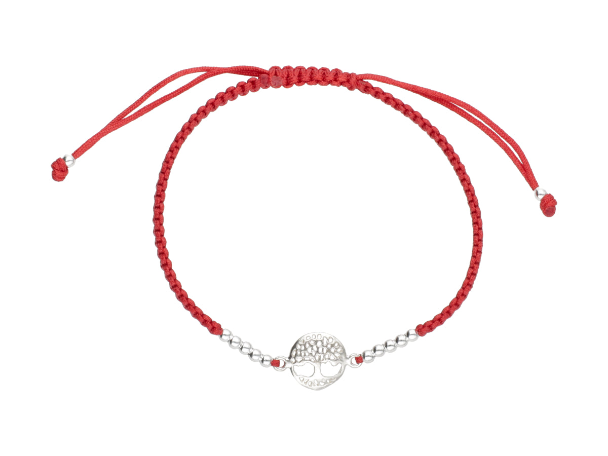 Pulsera hilo rojo en macramé con diseño de árbol de la vida en plata 925 y terminación en puntas con dos esferas en plata.