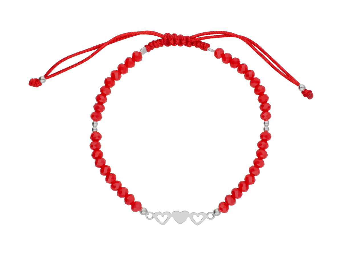 Pulsera hilo rojo en macramé y cristal con diseño de tres corazones en plata 925 y terminación en puntas con dos esferas en plata.
