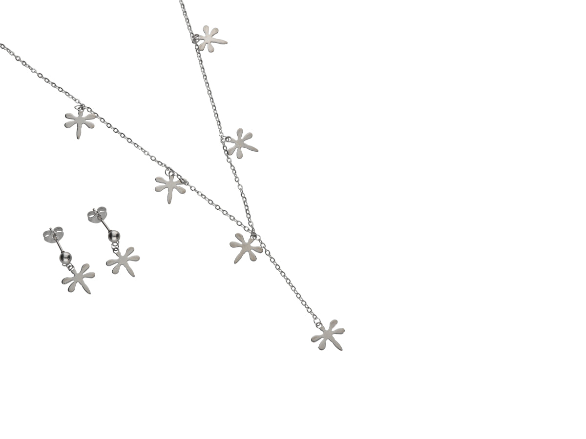 Set de caravana y collar de acero italiano. Collar de acero con dijes colgantes libélula y caravana colgante con diseño en libélula.